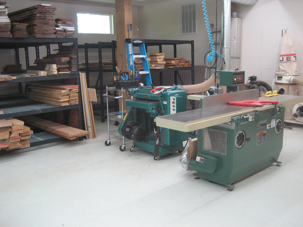 Planer and jointer with new lumber storage shelves not yet stocked completely.