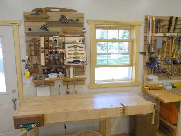 The bench side of the shop faces North. It is such a pleasure to have sunlight and pleasant views out the windows after being in the basement for many years. I contracted out the building construction. I did mill, finish and install the interior trim and stair rail. I don’t normally do much cabinet work, but did make the wall cabinets for the shop.