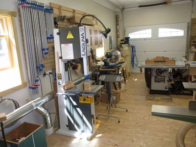 Here is a view of the machine side of the shop. Starting a shop layout from scratch, rather than building thru tool acquisition one piece at a time, allowed for a much more efficient working space. I moved the dust system from my basement shop but increased the main trunk from 5" to 6" duct and eliminated many feet of secondary runs. Overall the airflow at each tool is substantially improved. In the fore-ground is my Laguna 16 HD band saw. This is without a doubt the workhorse of the shop. A shaper, chop-saw, belt/disc sander, grinder, and air compressor are all stationed on this side. I used a few sheets of Slat-wall throughout the shop for organization. It makes for a great way to store clamps on this side.