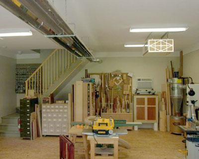 The back of the shop is space for wood storage, templates, jigs, and hardware/part drawers. The stairs lead to the 2nd floor attic. I added more Slat-wall and tilt-bins for hardware storage on the stair wall. I have an ambient air filter hanging from the ceiling. I also put in an air conditioner for the hottest of the Summer days.