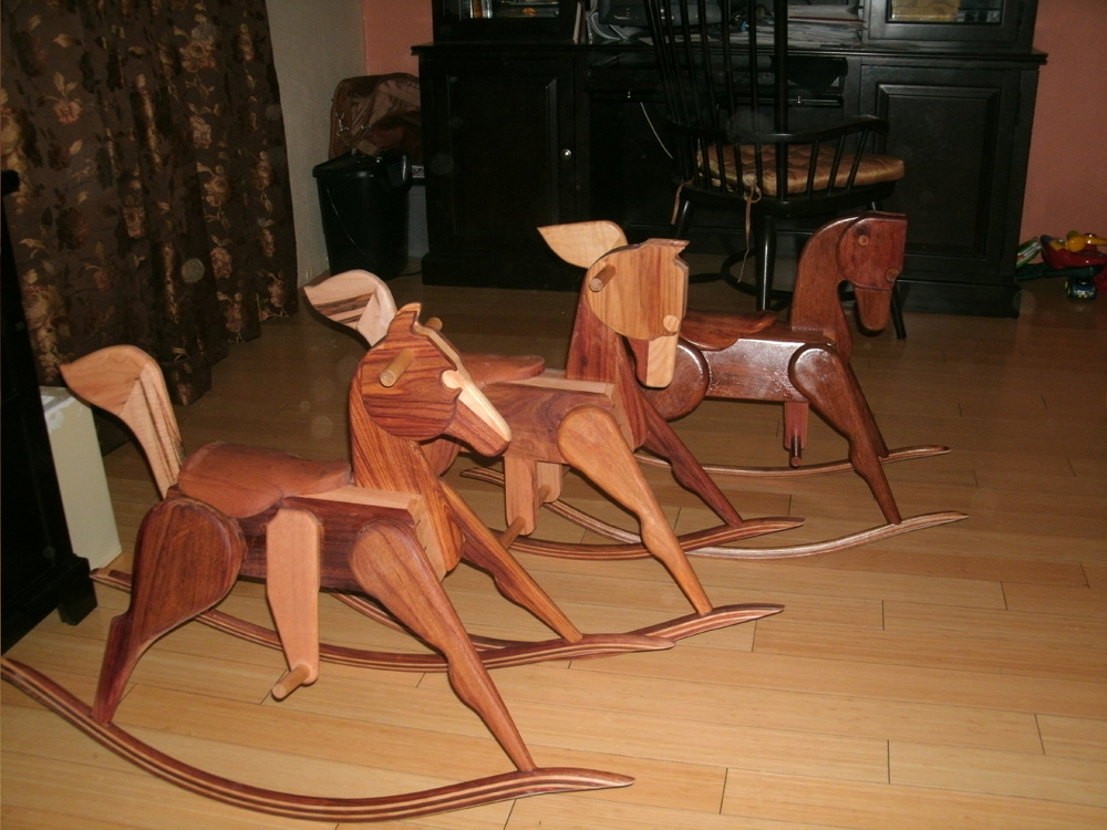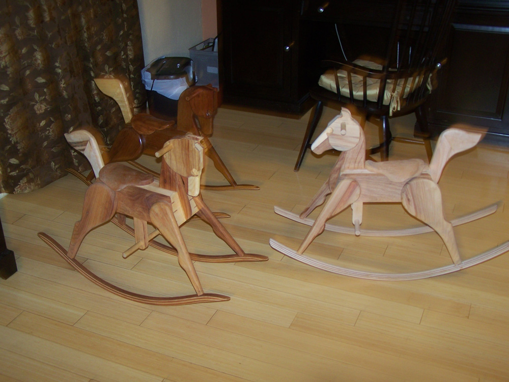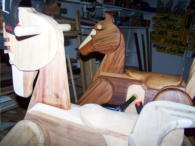 Here are several in the process of being built. I usually put beadlock mortise and tenons, or sometimes dowels, in each joint. These rocking horses are incredibly strong because of the hardwoods and those joints.