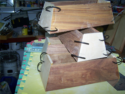 These are some of the bodies in the process of being built, made of jatoba and maple. I put biscuits in the corners or splines and then splines across the miters of some contrasting wood, for looks and strength.