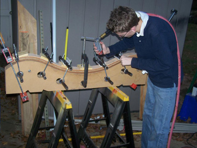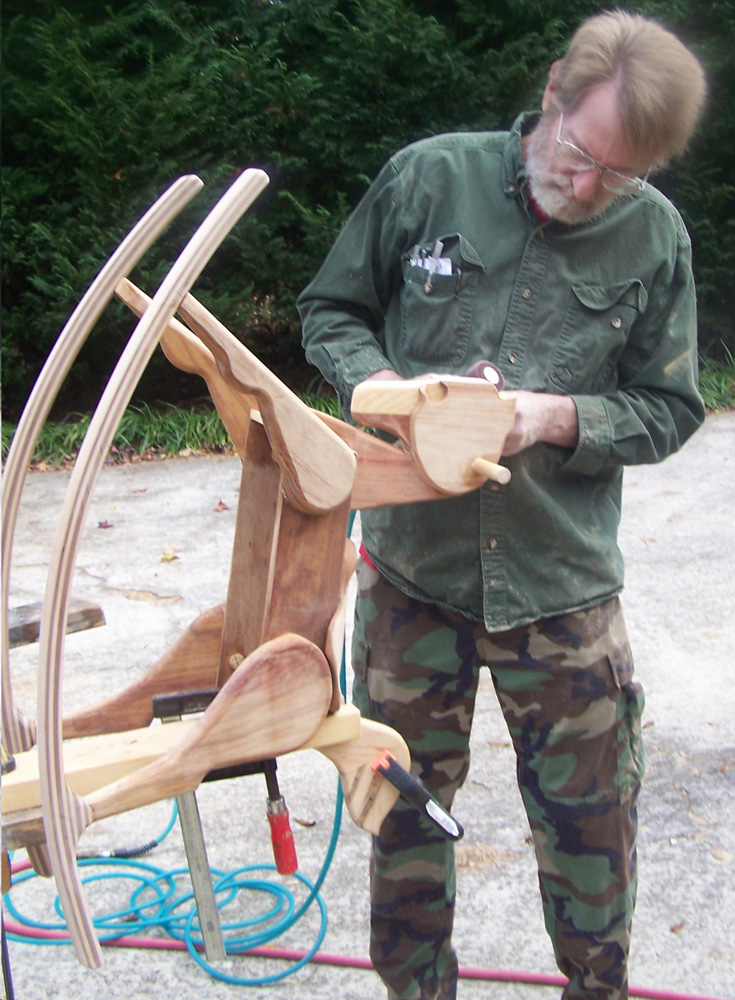 This is me tuning one up just a bit. I laminate the rockers for strength and looks. I built the first ones with a recurve similar to Mr. Maloof's rockers, but two year olds did not seem to like how those rocked as well, so I changed to suit my little customers.