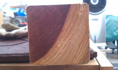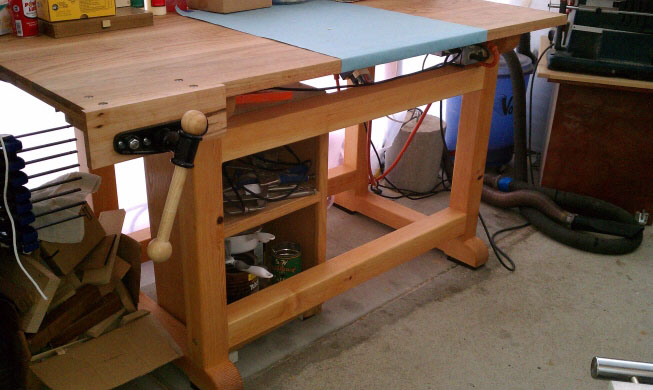 the project is complete to the point I can do for a month or so, since the only 4x4 redwood sticks I could find were green. I have to let it sit for a month or two before I put a finish on it. (By the way, my workbench was green redwood too. I never had any problem with it warping - at least not yet. It is pretty stout though - which is not the case of these end grain slices.)