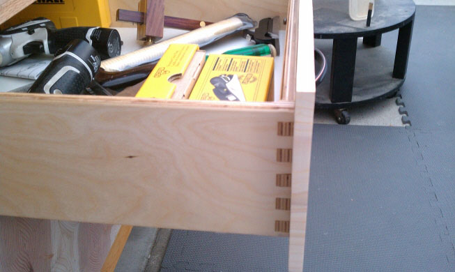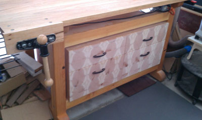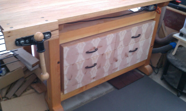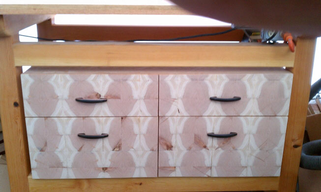 I just recently finished my stout work bench and began the carcase to hold four large drawers underneath. The drawers are made from Baltic Birch 1/2" plywood with finger joint corners. I wanted to make the drawer fronts fancy, so I went to the home center and bought a 8' 4x4 Redwood stick with a great looking end grain pattern. Each piece in this model is a 1/2" thick of the end grain. There will be 4 drawers: two smaller on top and two large on the bottom.