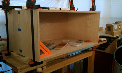 Everyone who sees this say it is one of the most unique joinery assemblies they have ever seen. It is a 5-sided box and each joint is a lock-miter joint. The bottom and top grooves face up, and the sides sit in the grooves so the sides can't fall outward. The top comes down and locks it all into place. The sides and top lock the back in. This is a picture of the first dry fit before the center vertical section was inserted (with a rabbet top and bottom.)