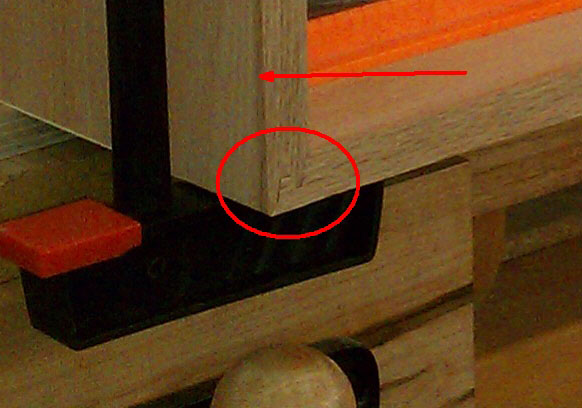 Close-up of lock miter joint, showing sides sitting down into the track provided by the bottom. I glued 1/8" oak trim to the oak plywood before routing the joint.