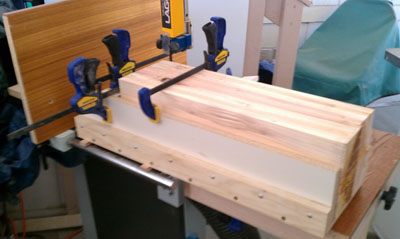 This is the band saw sled I made awhile back. (You don't see many of these around.) I drew it up in Google SketchUp and made it available to the 3-D warehouse. tag: band saw sled