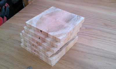 An 8' stick, cut into 4 pieces, glued together, and cut into 5/8" slices yielded almost 30 slices. (5/8" includes the width of the band saw blade.)