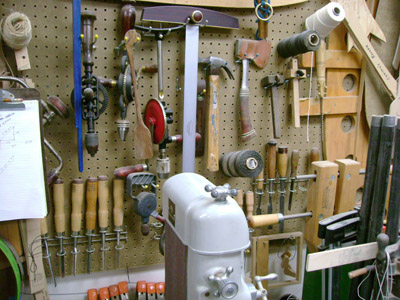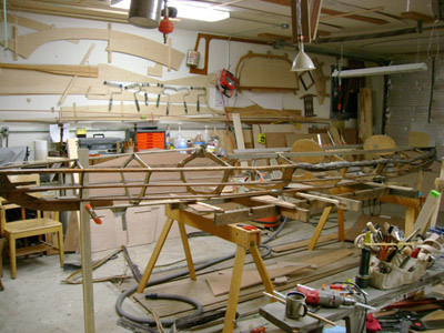 I work pretty much alone but my wife, who is a painter, has her studio above my shop so she is there to lend a hand when needed. Sometimes she likes to do her own projects in the shop as well. We have a Nutshell Pram hanging in our living room that she built in the shop.