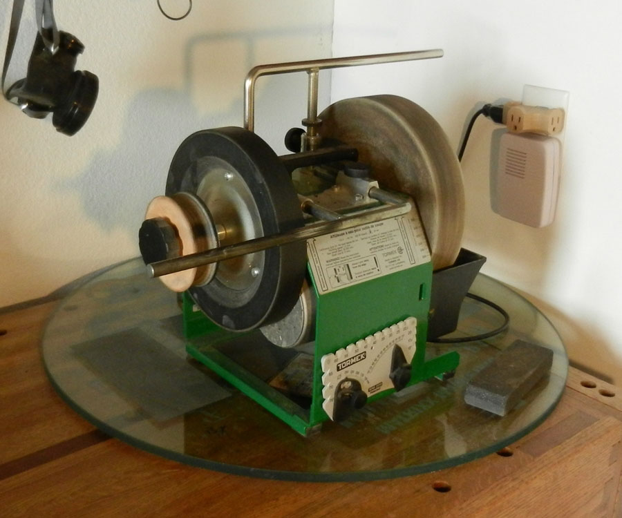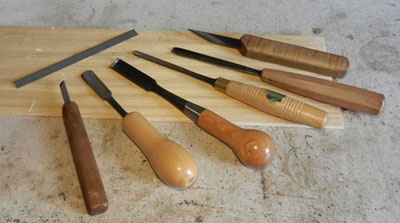 I am a professional maker of violins, violas and cellos. The photo shows the small bench where 90% of my work takes place. The tool chest on the left holds planes, marking and measuring tools, various parts and an assortment of clamping forms for my instruments. Files, knives and gouges are in the rack at the back of the bench. Much of the work is very precise and requires controlled, directional lighting. On the right is a small cabinet that protects my stereo from shop dust.