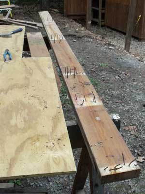 I have a hunch that the old shed was built during the month of January. I think this because the builder must have gotten a pneumatic nail gun for Christmas. Everywhere that two or three nails would have done the job holding a rafter or purlin or brace there were seven or eight nails. Geez, what a pain!