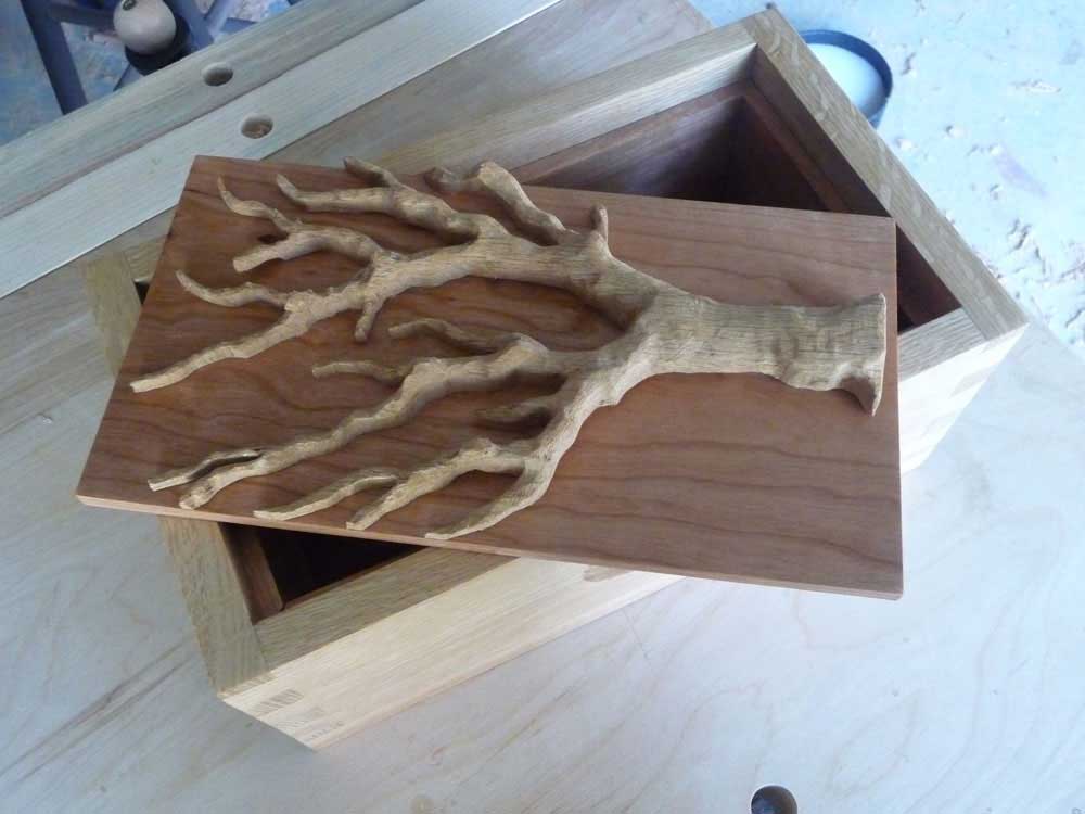 The tree box was a 1 day project that started out as just practicing cutting a few dovetails. I modified the design as I went and decided to add the tree carving last. The basic shape was cut out with a scroll saw and I then used a combination of hand carving and a dremel tool with a carving bit to get the final shape.