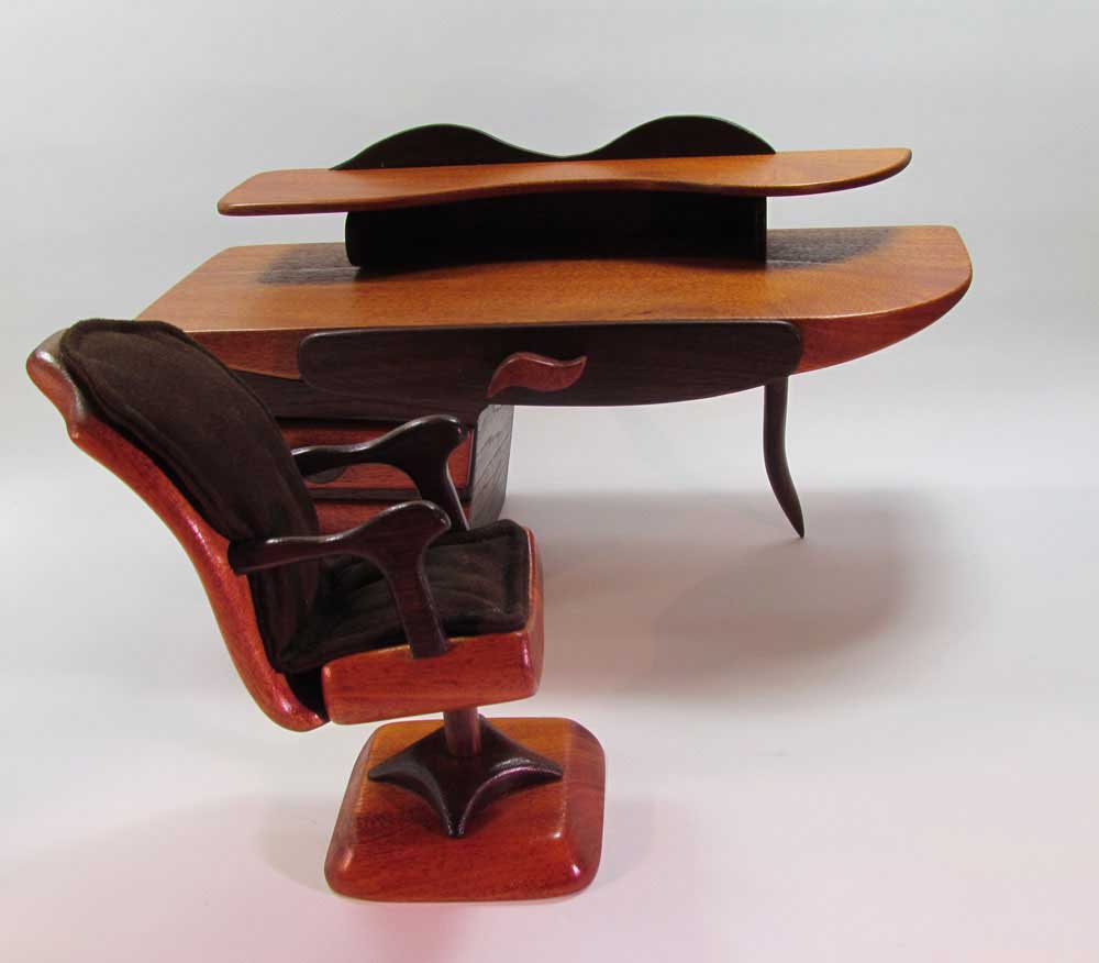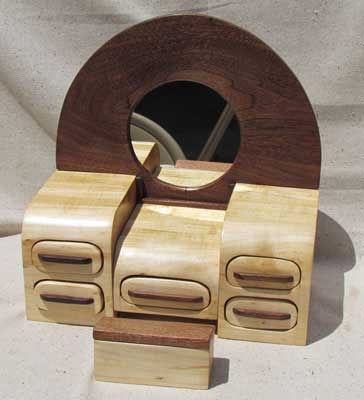 This jewelry box is a scaled down desk, constructed of mahogany and walnut. It has suede-lined drawers and a matching chair with suede cushioned pad. The "s"-shaped pull knobs are turned sideways. The top and desk drawer has a walnut face with contrasting mahogany pull handle. The desk is supported on the right with a post style leg also made of walnut. No, the chair doesn't swivel but the three drawers are fully functional.