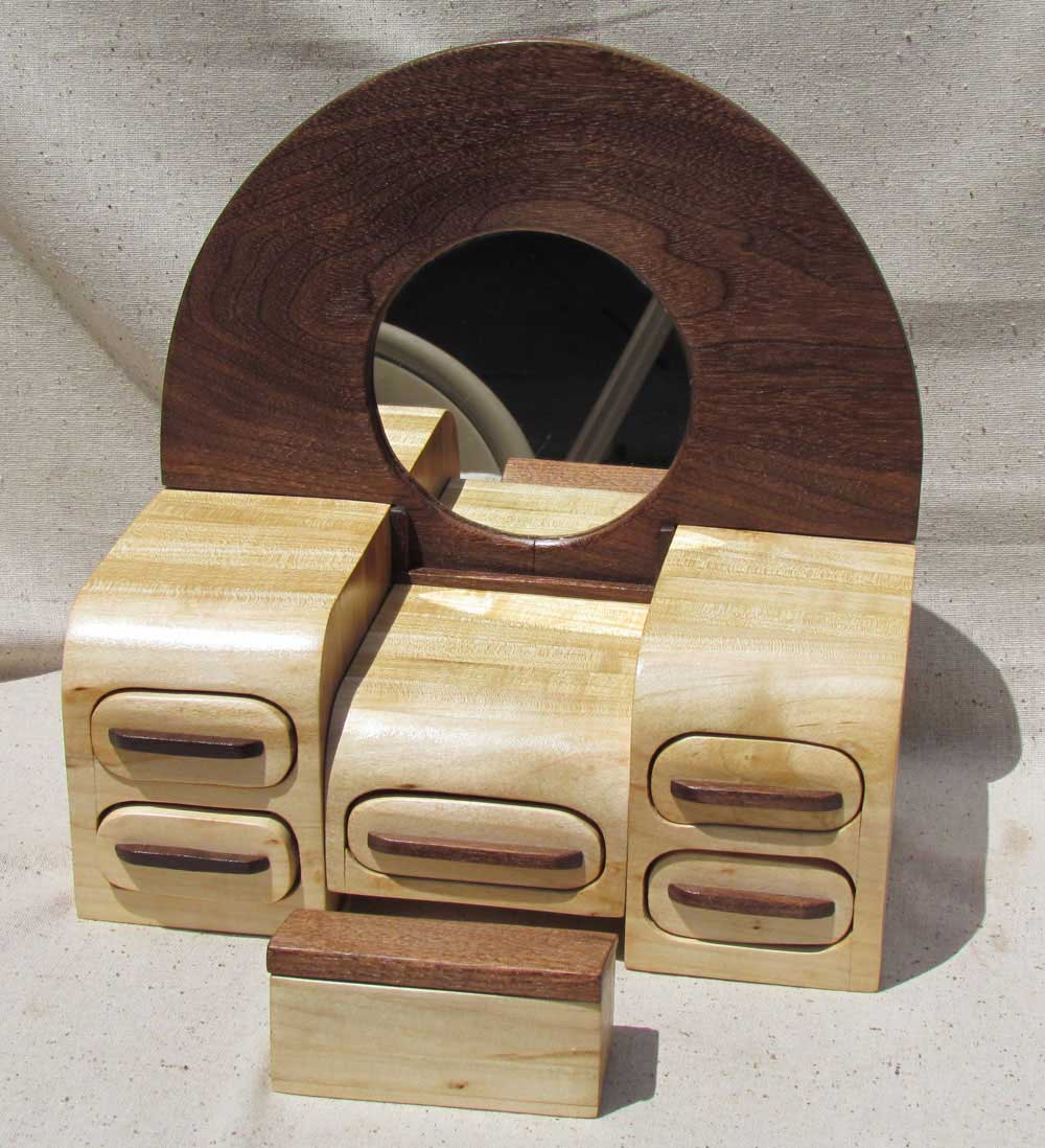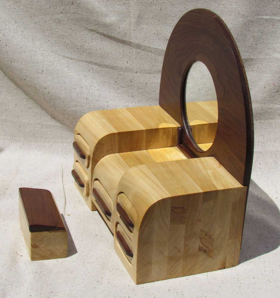 This was modeled after an actual antique Art Deco Waterfall vanity. Made from walnut and ambrosia maple woods, its features include large Walnut wood panel with mirror, elegant nostalgic "waterfall edges", five contrasting pull handles and a contrasting stool that has a compartment under the lid.