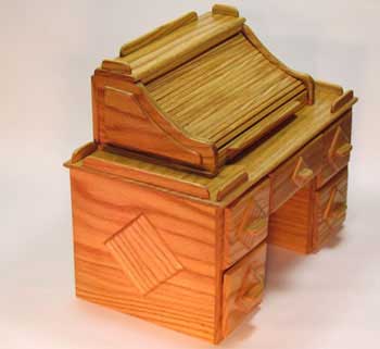 The "Roll Top Desk" is made completely of white oak and features an authentic roll top hutch, six pigeon holes, oak diamond on-lays, and five drawers with removable black suede lining.