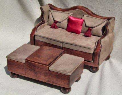 This is my version of a scaled down wing arm sofa with camel back, bun feet and ottoman. Upholstered in cream suede. The wood is actually wormy maple stained with a red mahogany.
