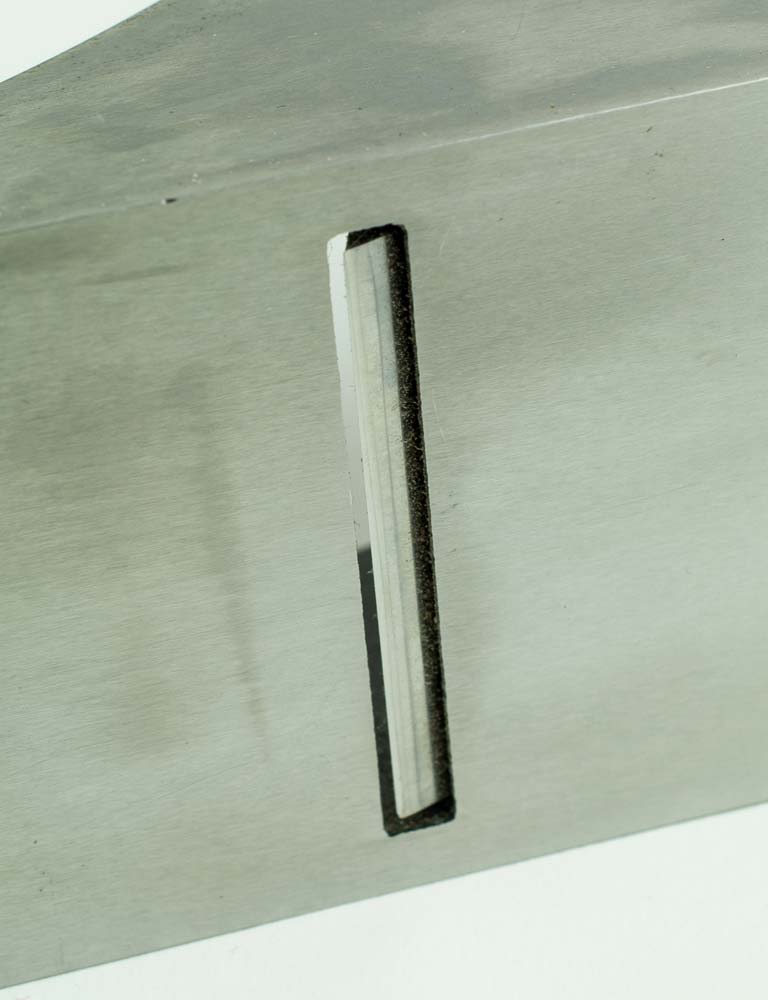 The rule of thumb here is to slide the lateral adjustment lever toward the side of the blade that is cutting too deeply. You can test the balance of the blade depth by sighting down the sole and looking for the black line that shows the presence of the blade. Or you can look directly into the mouth from the bottom of the plane to judge whether the blade is the same distance from the mouth edge on both sides. A third method is to take a thin wood chip and stroke it gently on each side of the blade, paying attention to the size of each shaving produced as well as the sound as the chip passes over the cutting edge. The acid test, however, is to make a cut on a scrap board to see if you get shavings of equal thickness from each side of the blade. On a flat board, you would expect to get a full-width shaving of uniform thickness. If the shaving is light on one side or missing altogether, move the lever slightly to the side that is cutting heaviest and retest. A series of small, successive adjustments will usually produce better results than making wider swings in the hope of hitting the correct setting in one movement. Often, moving the adjustment lever affects the overall depth of cut, so be prepared for follow-up depth adjustments.