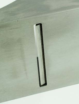 Finally, to get the sharpest edge, use David Charlesworth's ruler trick to put a very slight back bevel on the blade. Place a thin ruler lengthwise on the rear edge of your stone. Then, lay the blade on the stone bevel side up with the cutting edge off the far edge of the stone. While making back-and-forth sideways motions, carefully pull the blade onto the stone, then push it off again, repeating the process up to 10 times. Do this using each of your stones, working to your highest grit. The result—a high polish on the extreme tip of the blade back that gives the sharpest edge. Once done, this step need not be repeated, though you may wish to refresh the back bevel with your finest stone each time you re-hone your microbevel.