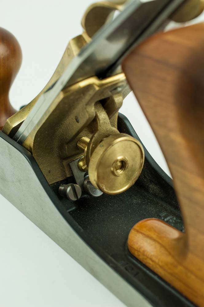 The cap iron should hold the blade and chip breaker firmly to eliminate chatter but not so tightly that the depth adjuster can't be easily moved with two fingers. With the lever loosened, tighten the screw until it holds the blade and chip breaker snugly in place, then snap the lever down and test the ease of adjustment. Once you've achieved the right amount of pressure, leave the screw alone and remove the iron by raising the lever.