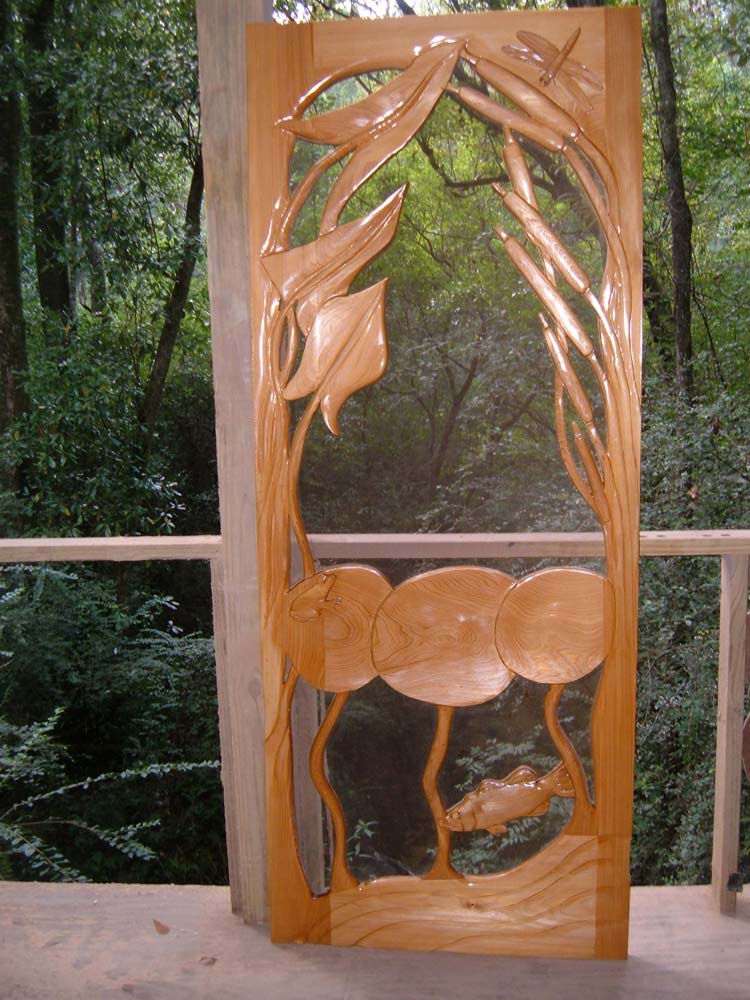 I carved this pond scene with cattails, arum leaves, bass, lily pads and other pond critters for a couple in Montrose AL who have a cabin on a pond.
