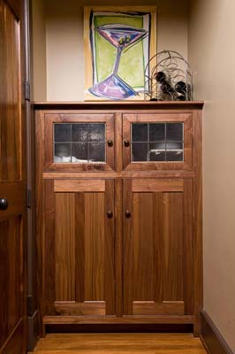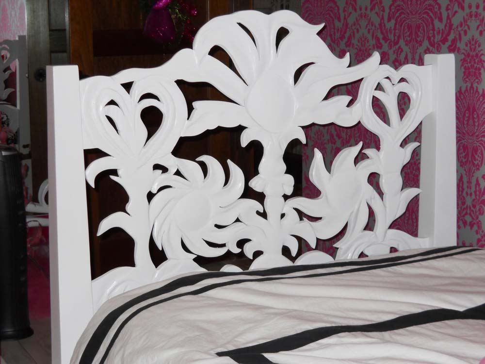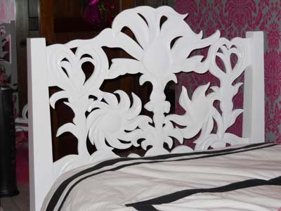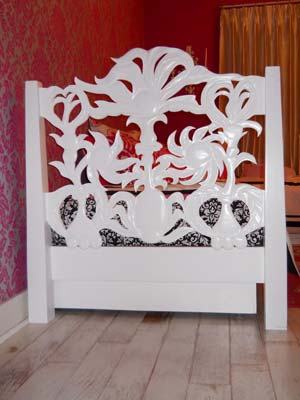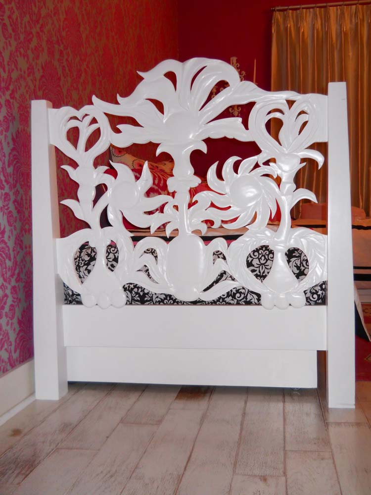 Matching the mirror is a headboard/footboard that I carved using my take on the elements in a wallpaper pattern that the client wanted to use.