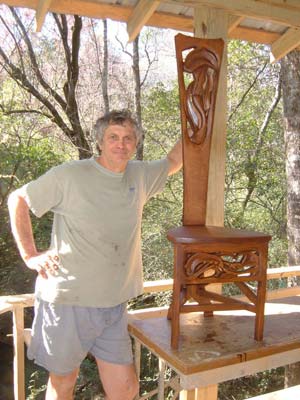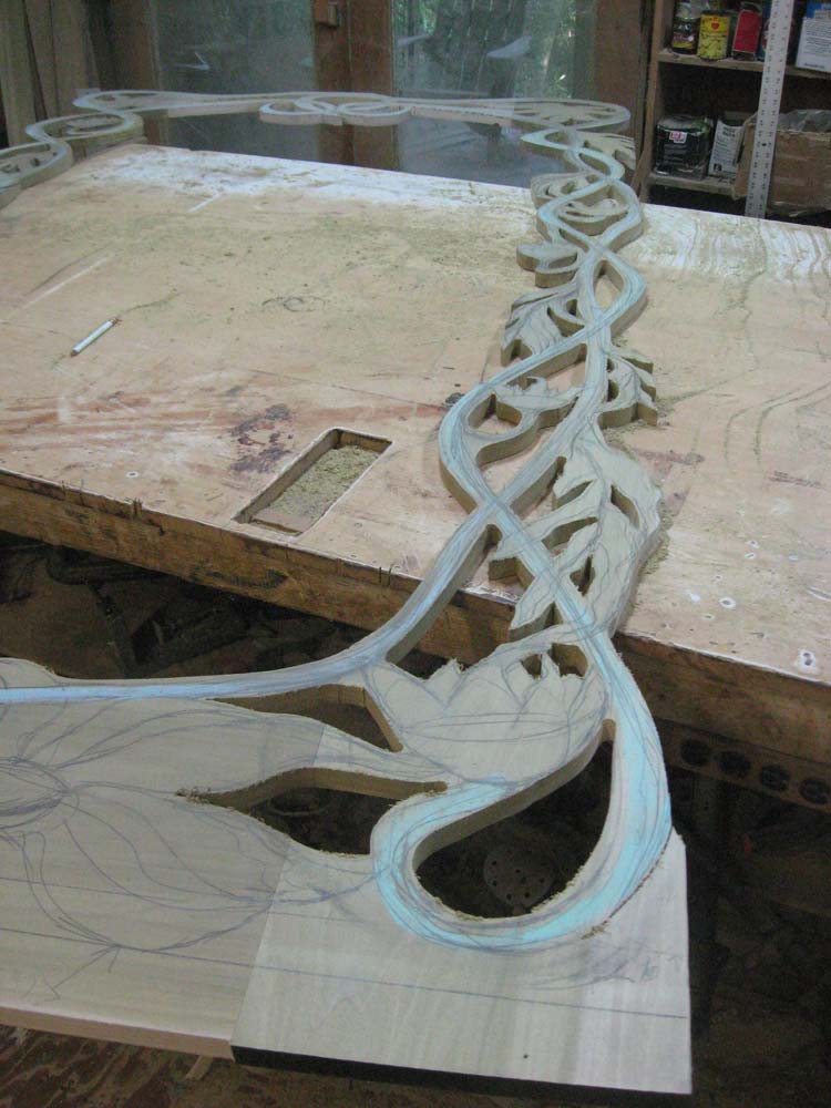 I drew the vines directly on the assebled rectangular frame. I cut out the shapes with a Bosch sabre saw and I carved most of the shapes with a Bosch 12000 rpm side grinder--an extremely versatile tool. There is some carving done with hand held chisels out of my mixed bag of old chisels, but I try to design a big piece like this one so that hand carving is minimized. I sand a lot of the pieces like this one with Festool random orbit sanders and some with a Fein multitool sander.