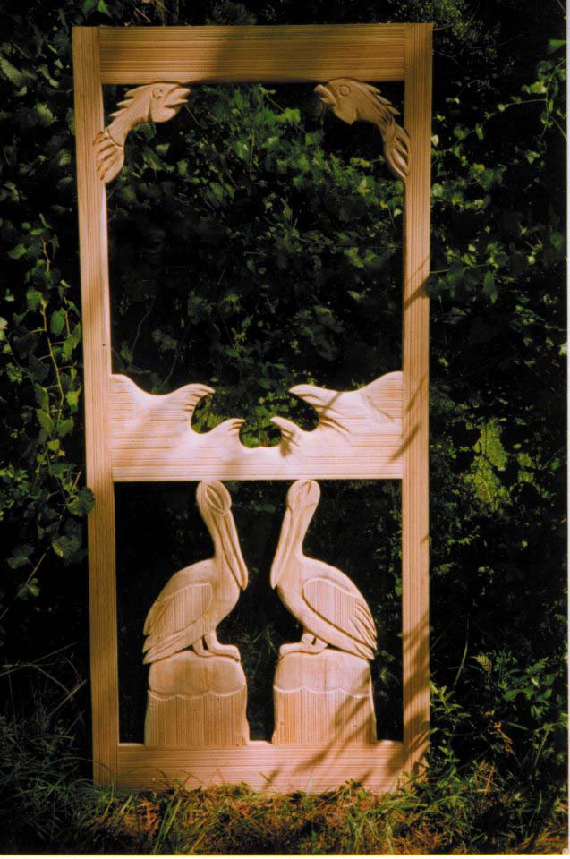 Pelican screen door, cypress. Door is shown before the bronze screen wire was applied. The door pull was a carved shrimp.