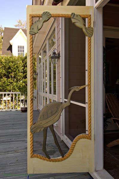 Screen door in cypress with heron and mullet and carved rope molding.