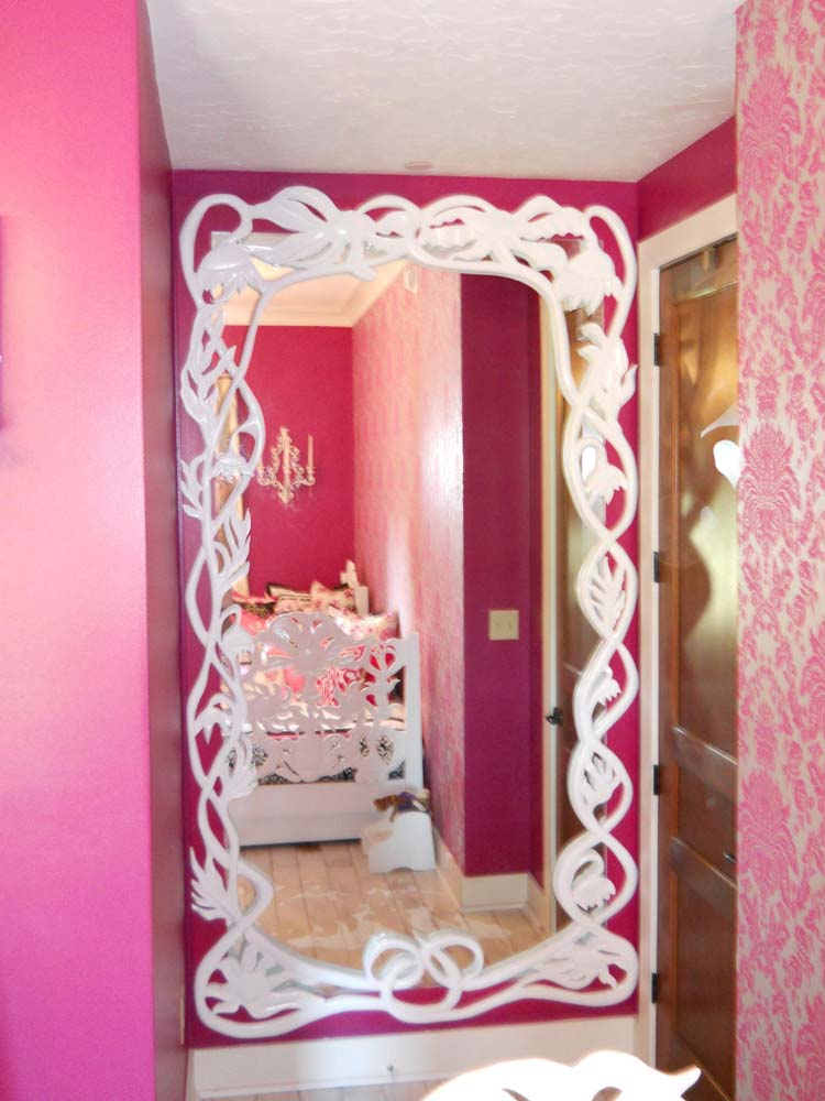 She wanted the base or back part of the frame to cover the edges of the mirror and match the magenta walls. She wanted me to do one of my freestyle vine motifs for the frame. I sort of made it up as I went along.