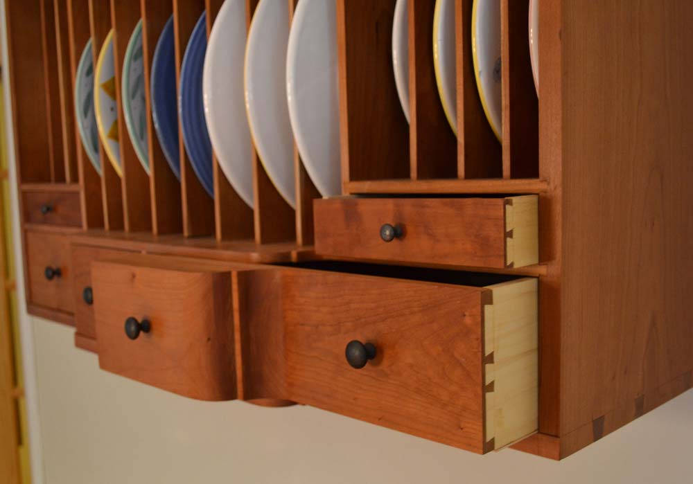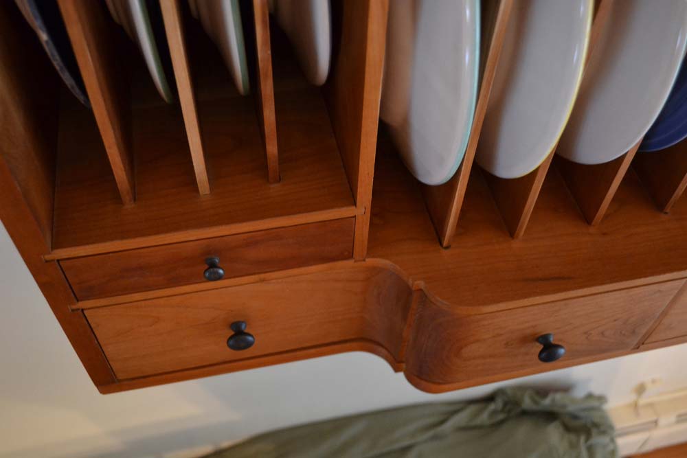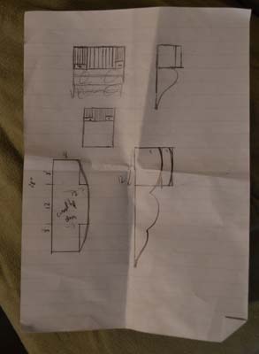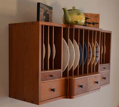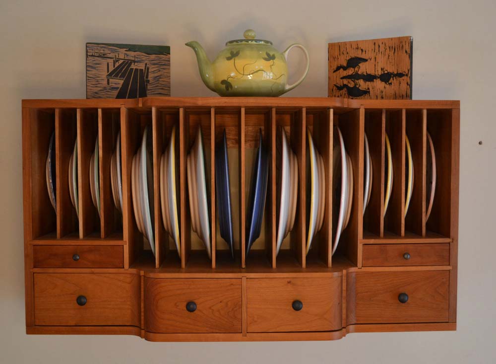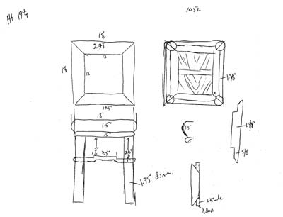 Here are a few pictures of my work. This is a plate rack that I made for my wife for Christmas...you'll see a theme here (the coffee table was a gift for her as well). I've included a pic of the first sketches I had made of plate rack ideas. I started with a colonial design with plates stored below in more of a displayed fashion and ultimately dropped the shelves that were below and used an article by Lonnie Bird about making the "gallery" of a secretary desk for the mechanics of the sliding dovetail and angled rabbet dividers. This was my first project with re-sawing and to get the visual interest of the curve (caused by housing dinner and dessert plates) I stack laminated the lower drawers. I finished the plate rack with hand rubbed tung oil/linseed. The carvings on top of the plate rack were done by me as well. The one on the left is a zig-zag bridge in a japanese garden, carved in MDF and hand painted while the right is a woodcut that I've made prints from...it is "heron reflected" carved in pine.