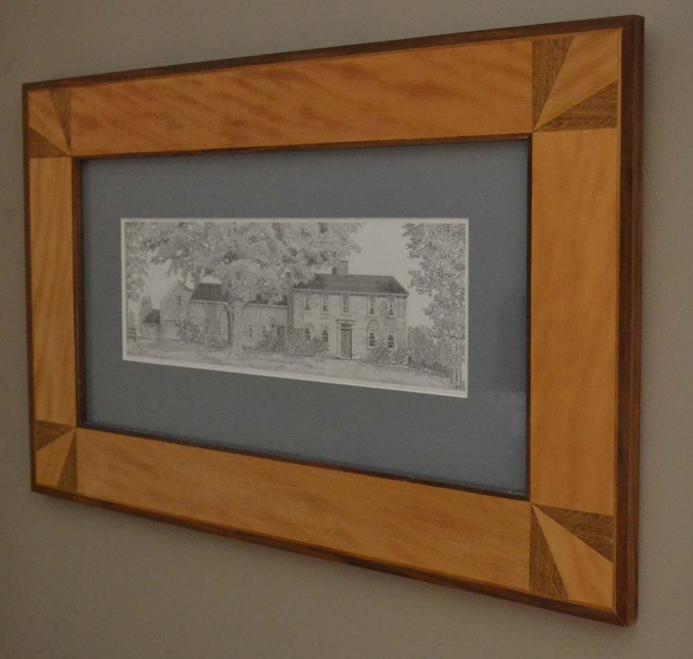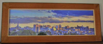 These are a couple of picture frames I've made. The first one is of a pen/ink drawing of our first house, a 1700's salt box in NH-working on that got me into woodworking. The other is of a digital art photo of the Portland ME skyline that I made the frame and was a birthday present for my wife. The artist whose print is framed Ross Elliot.