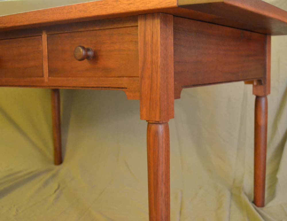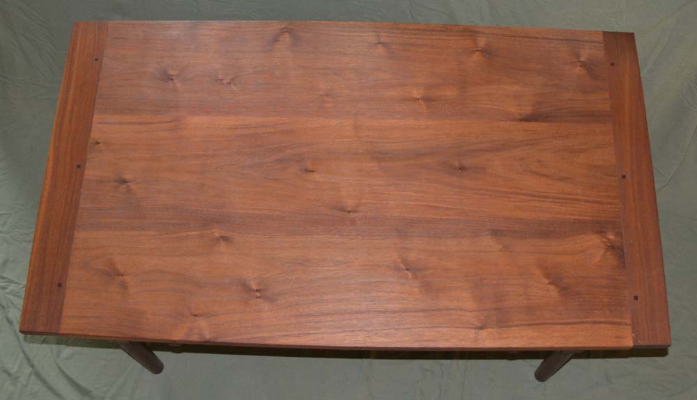 The secondary wood on the walnut table is poplar, and the finish is dyed and hand-rubbed shellac.