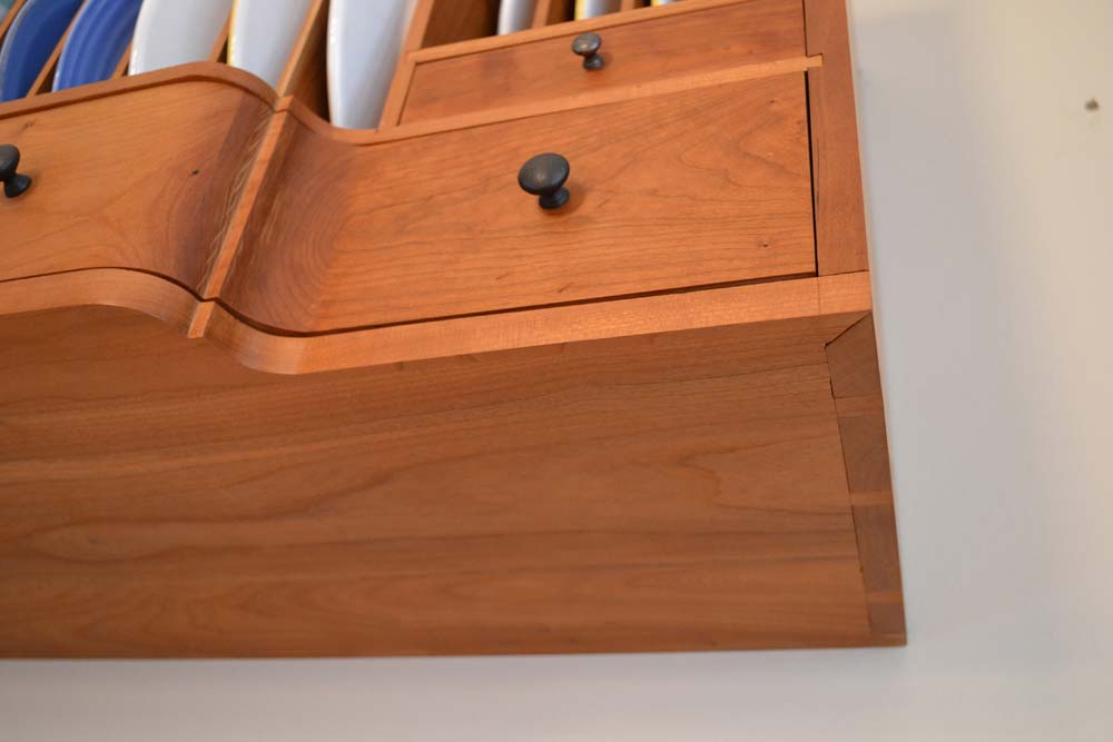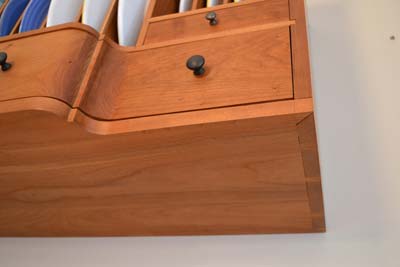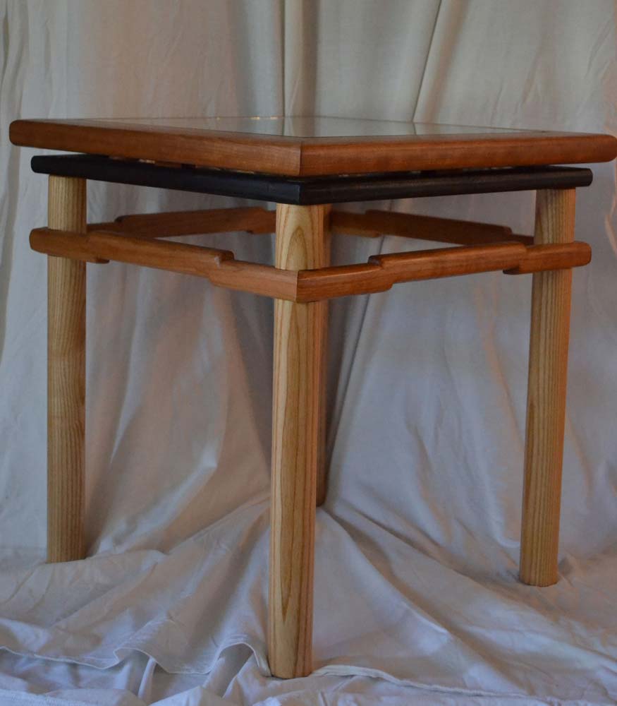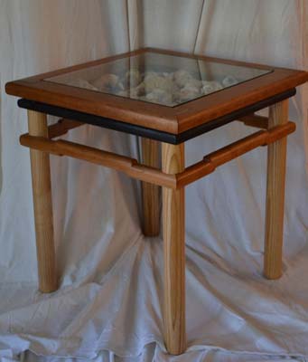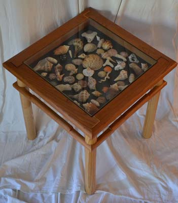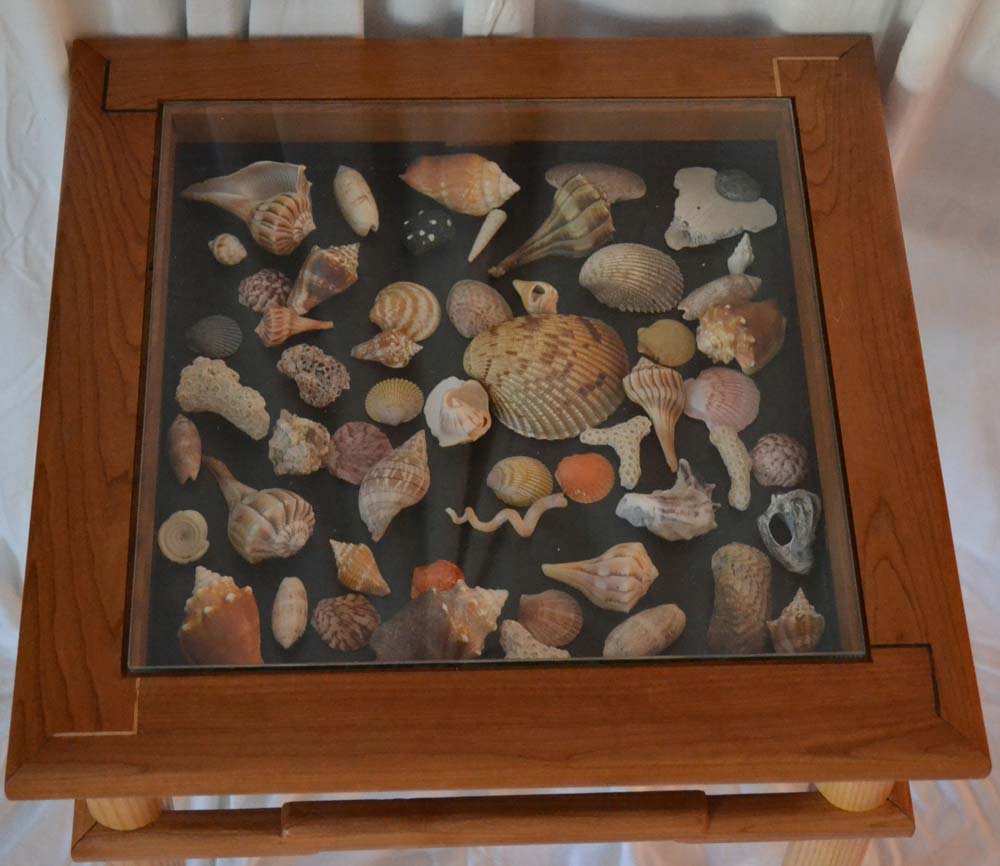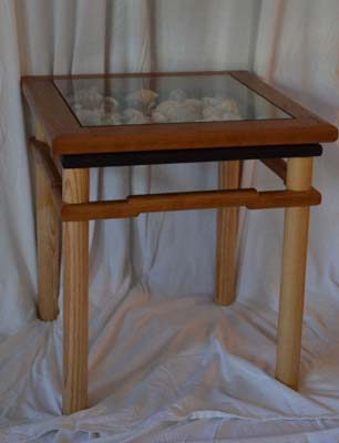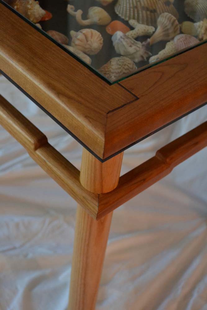I recently completed an Asian inspired side table (ash and cherry) that has a display area under glass that I designed to hold shells collected on a family trip to Captiva Island. The cool thing is the table is based on an antique that was in the house we rented, so I did a basic measured drawing and modified the construction so there would be the display area and also to take care of a split that occured in the original due to the design.