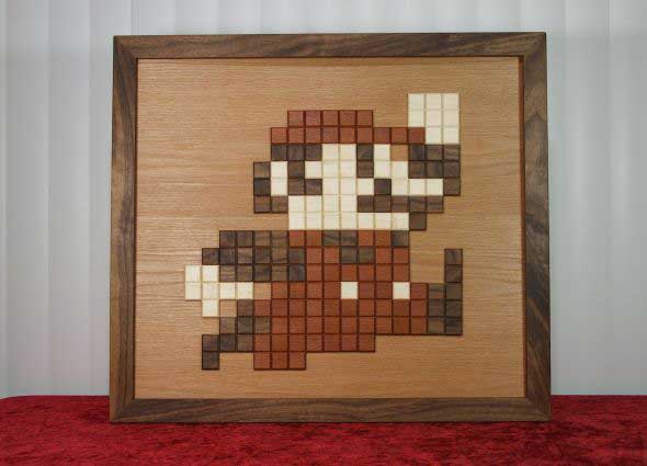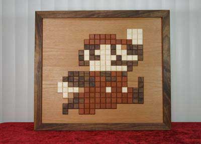 Super Mario made out of leopard wood, maple, walnut and red oak. 170 total pixels, each 1" x 1" with a 45 degree bevel on all 4 sides to add depth and attention to every piece. Mounted on red oak plywood and framed with walnut. Finished with a blend of boiled linseed oil and polyurethane. Includes picture framing hardware so it's ready to hang.