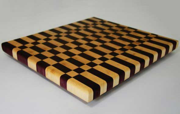 End grain cutting board made from purple heart and maple. Finished with butcher's block oil and wax.