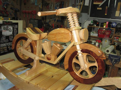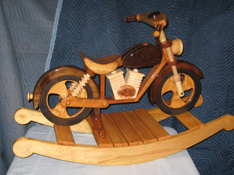 I made three rocking cycles for my grandchildren. I just let my friends and family think they were difficult to make, the truth is that they were one of my simpler projects and I had a lot of fun making them. The first one I made I entered in a wood carving competition and won first place in the Carousel Horse-Novice category and first place overall for People's Choice-Novice. My grand kids love them.