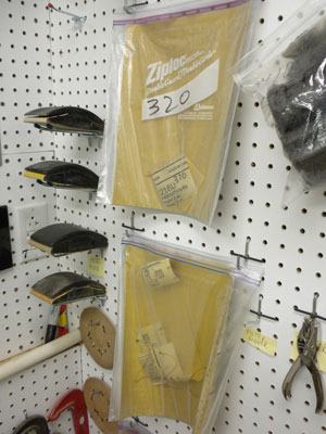 A sheet of sandpaper, 9"x11", fits perfectly into a one-gallon zipper-locking bag, which can be labeled and hung on pegs. Use a paper hole punch "above" the zipper.