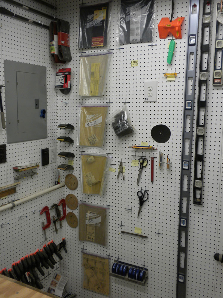 All sanding supplies are in one corner of the shop together, including belts, steel wool and sanding