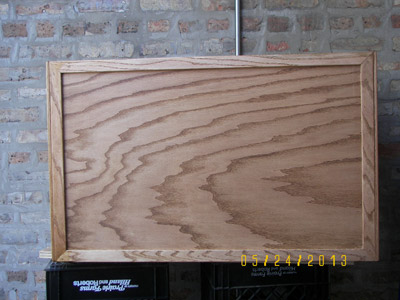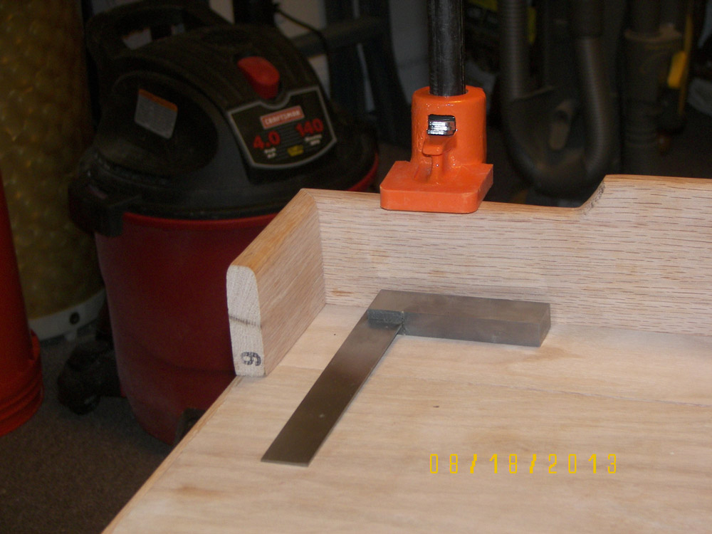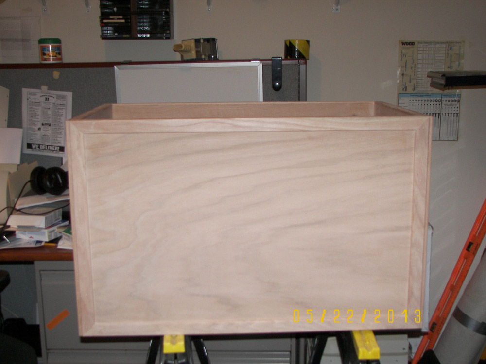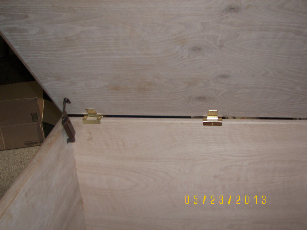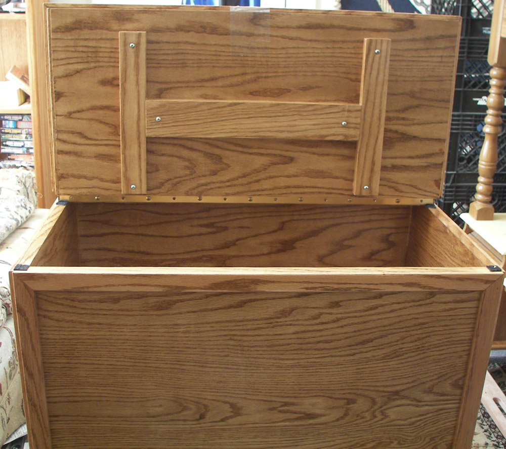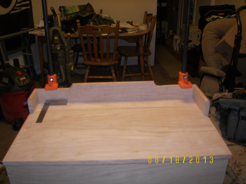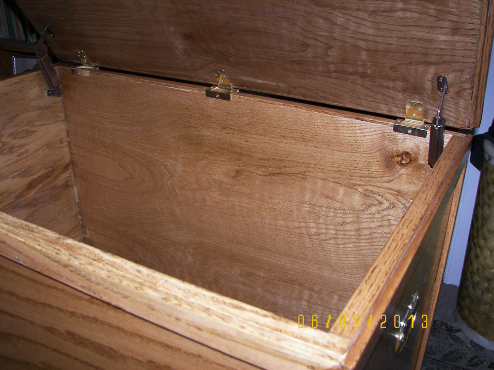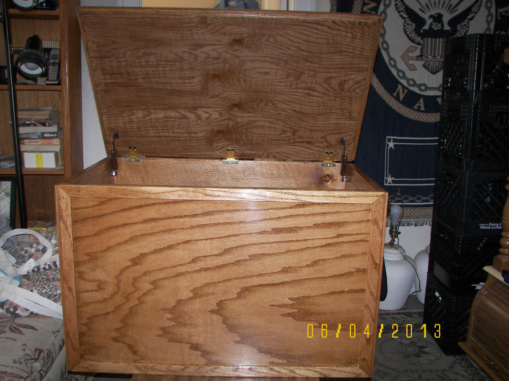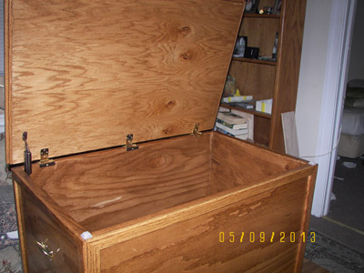 After posting photos of my first two toy boxes online, I changed my plan and started Toy Box #3. For this one I got very picky and tried to make it as perfect as I could. I added a back rail made from 1 x 4 oak stock, which I cut with a jig saw. Then using my router I rounded over the top edge and made returns hand mitered in order to include a cushion to sit on. I reinforced the top with some scrap stock (see the "H" shaped form inside the lid), which added strength to it. I tested it out by having 2 guys with a combined weight of 325 lbs. stand on it, and it didn't squeak or bow or anything!
