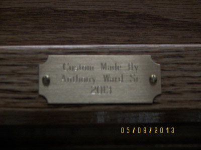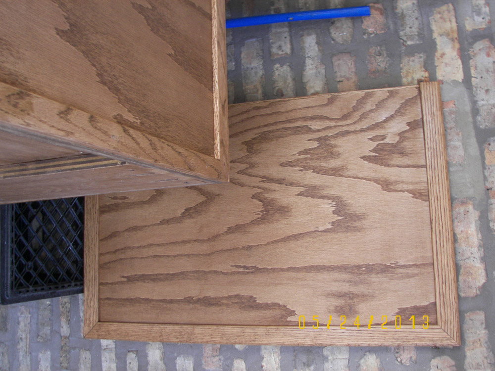 It was no easy feat but I got it done. I sanded it by hand to 220, wiped it down with a damp sponge many times to help remove the dust, and then applied a finish of Medium Walnut Watco Danish Oil and numerous coats of semi-gloss water bourne polyurethane applied with an HVLP sprayer. This worked great and there was almost no odor and it dries in about an hour, unlike oil based which takes almost a day to dry and will show every hair or flaw you get. The water-based polyurethane can be recoated in about 1-2 hours and is very forgiving. Then I spent about a week of putting on several coats of paste wax and hand rubbing that down.