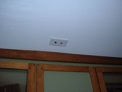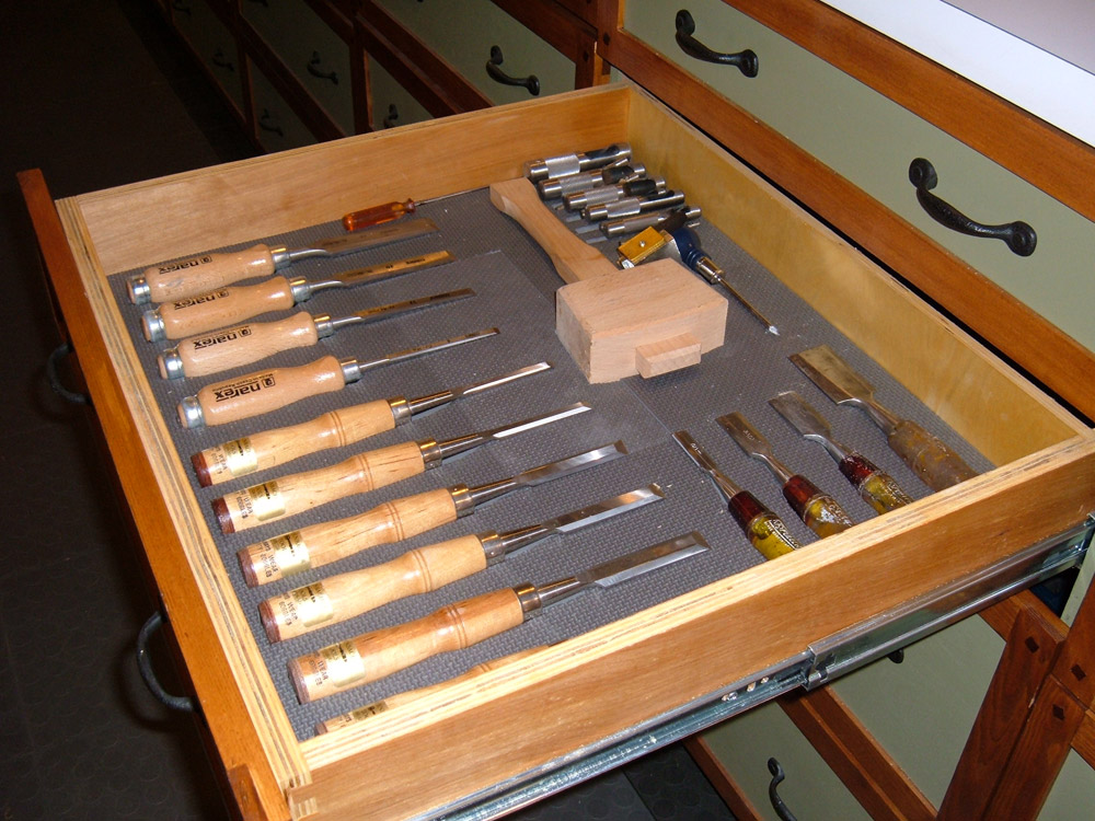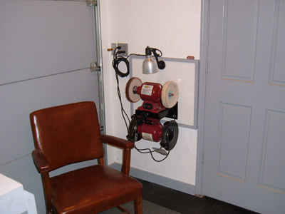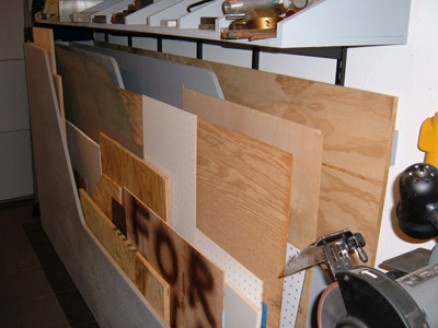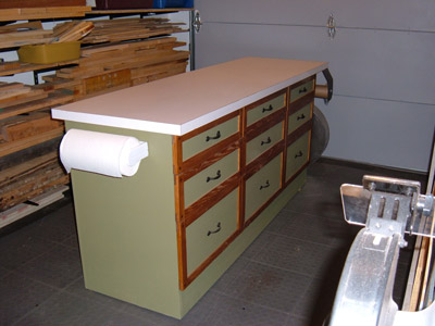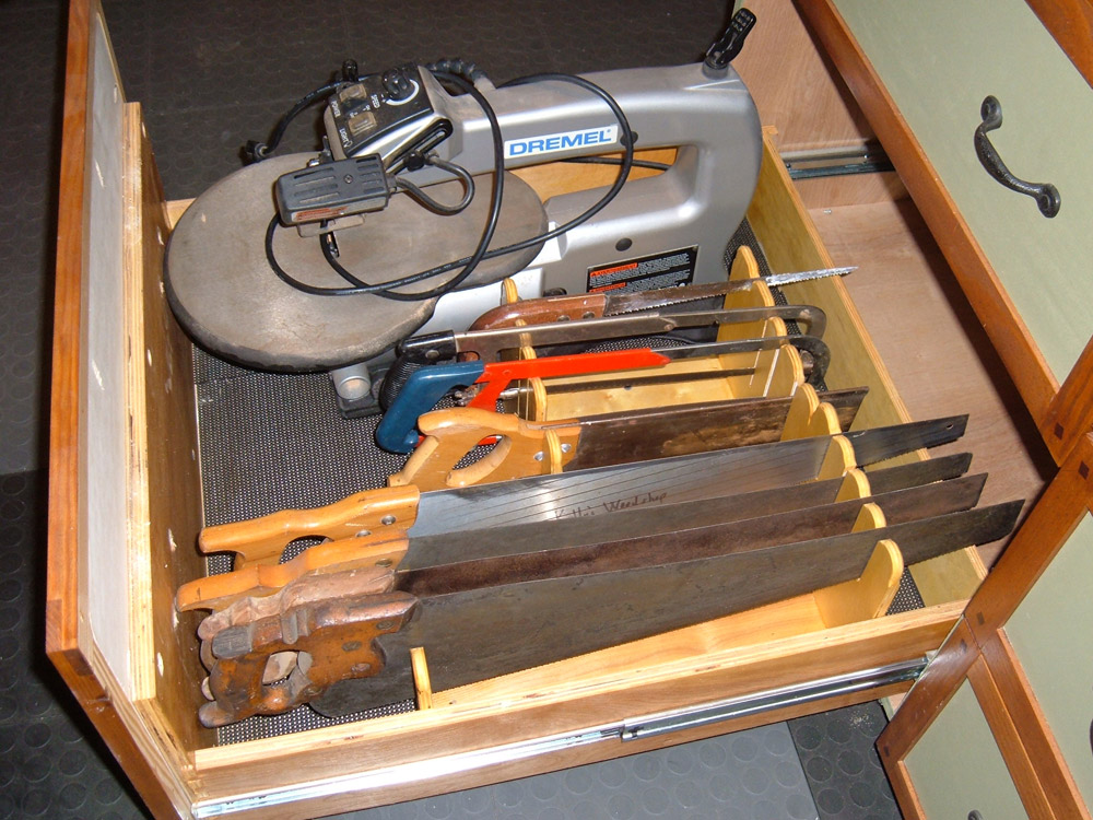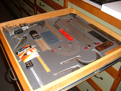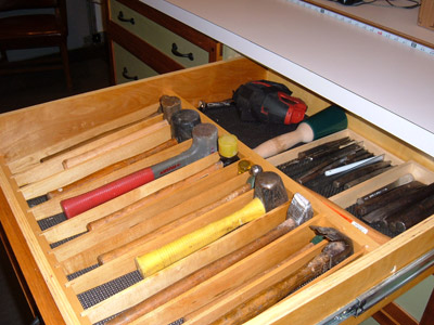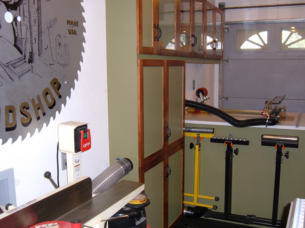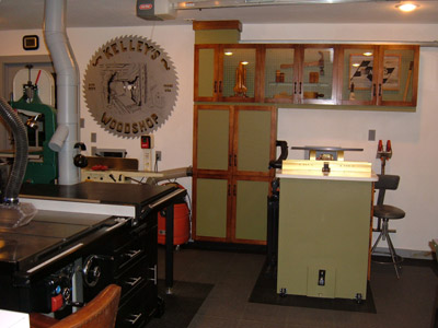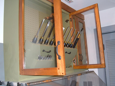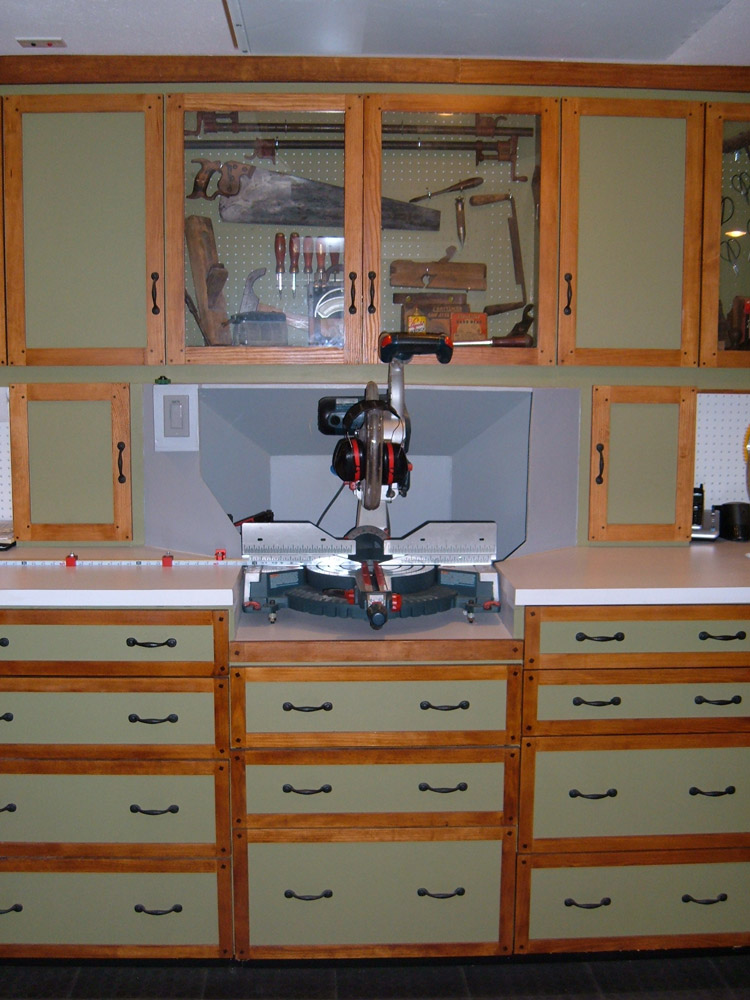 In the top left of the above picture you can see the panel with the green/red light. Also you can see the switch to the left of the chopsaw. I make sure that the tool I am using has a green light and that all of the other tools show red lights. Cabinets hold collectible antique tools, some from my dad, some that I've just picked up along the way.
