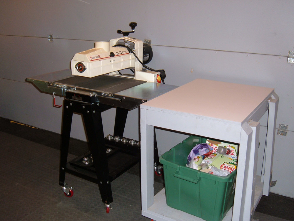The outfeed table in the down position. Next to it is the Dewalt planer, also on a flip-up table.