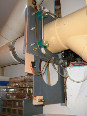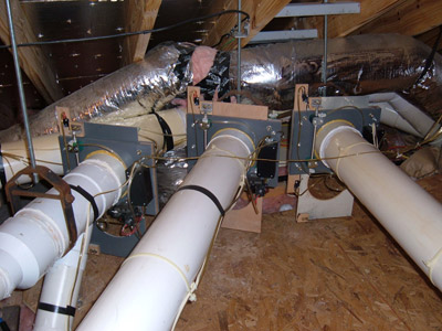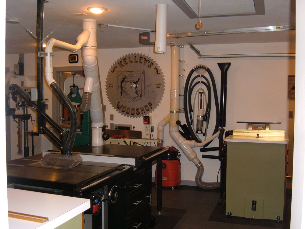 The space has its own central air and heat separate from the house. The storage room has a cyclone dust collector - the one blast gate is right over next to the double doors that go into the storage room. That dust port pulls air out of the sandblaster and the drill press. All the other blast gates are up in the attic, and all the piping is run in the attic. They are pneumatic with electric switches located at each of the tools. I was concerned after reading about the cyclone (true of almost any dust collection system) that you aren't allowed to deadhead them, make them suck against a brick wall. You need at least one gate open at all times. Having more than one blast gate allows me to have a smaller system and just use it machine by machine.