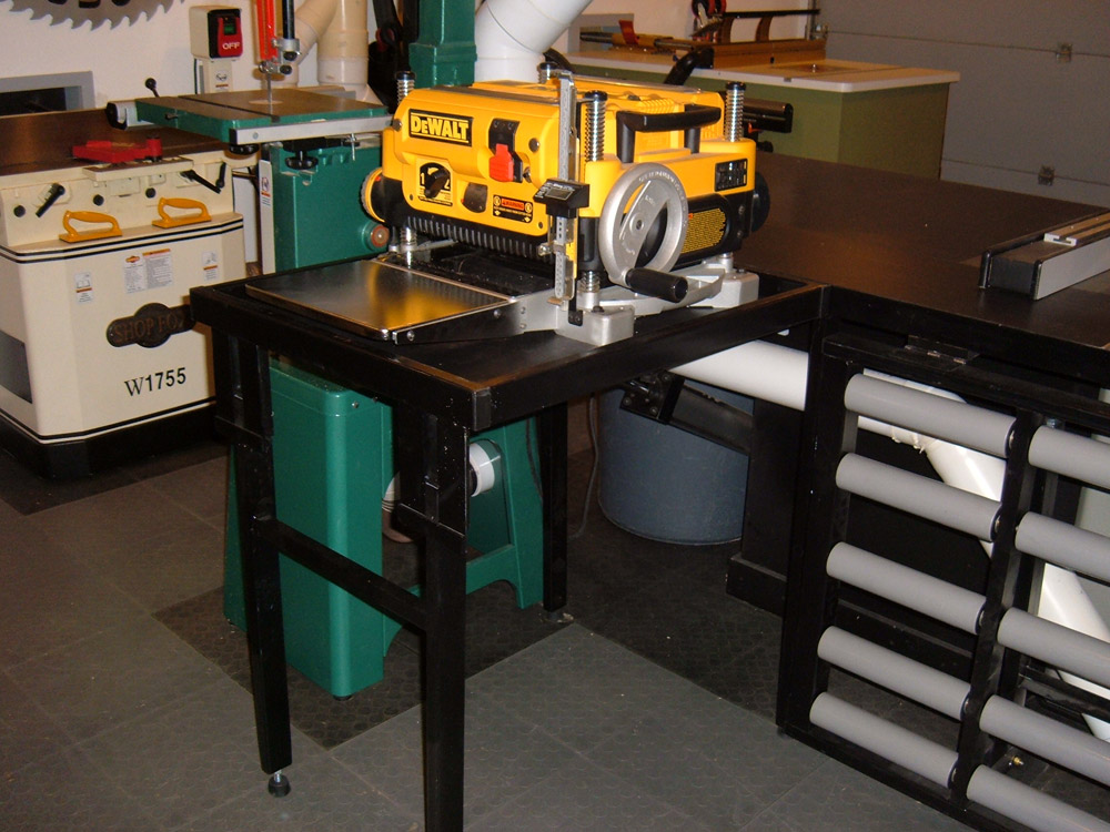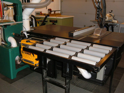 Both the outfeed table and the Dewalt planer flip up the same way and they have the same legs on them. That way my workbench acts as the infeed table and the table saw acts as the outfeed table. What I learned after I put this setup together is that the planer is HEAVY and its really hard to flip up the table, so I put a pneumatic cylinder on the planer.
