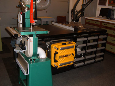 Right now I use a metal working lathe, but I have all of the parts to convert it to a wood lathe. I make sure I have good infeed and outfeed space for each tool. Many of the benches are all built at a size that makes them work well with the other tools - benches around the tablesaw are sized so they can help with infeed and outfeed.