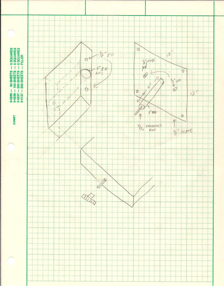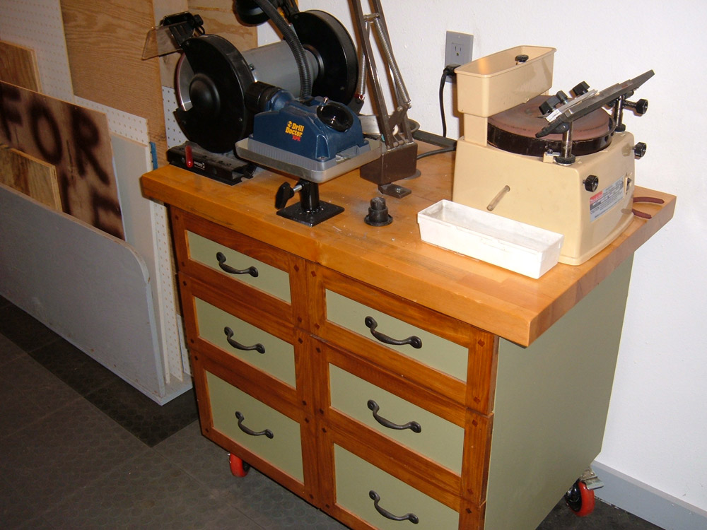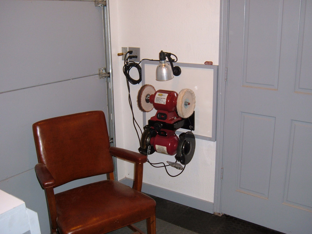 Set of buffing wheels and wire wheels. These were on individual stands until they got displaced by the milling machine. Came up with the bright idea (seen in magazines) of a flip over work table - unscrew the black knob, the whole setup just free spins, spin it until the other tool is upright, push it back and it is ready to go. The frame is dry erase board so the splatter from the buffing material is easily wiped off. Below is a rough cutaway view.