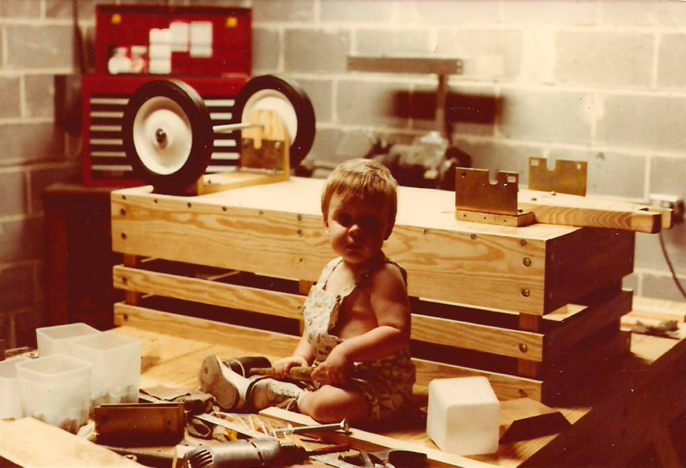 A few years later I started having kids of my own and by the time my second child was 6 months old, I had started assembling my first shop. I built most of my own tools including my original lathe and a disc sander out of scrap parts. Both of these have now been replaced with modern versions. I also built my own workbench that is now 35 years old. Over that time I have replaced the top with maple, but the base is still in its original form.