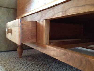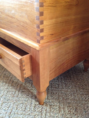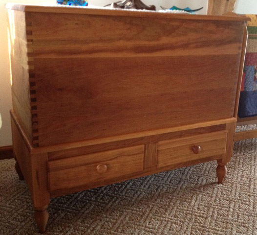 The first project I am showing is a modified reproduction Shaker blanket chest with drawers that I made recently as a birthday present to my wife. It was constructed from cherry wood, modified from a design I found in the book Pleasant Hill Shaker Furniture by Pierce. There are detailed drawings in the book, and the piece was modified from that design. The piece is finished using Watco Danish oil in natural tone, two coats, as I wanted the natural beauty of the cherry wood to develop over time. The finger joints were made using a Leigh D4R jig with finger joint templates. I used a 3/8 inch beadlock tenon system to attach the legs to the bottom frame. I've used my mortiser and cut my tenons in past instances, but the beadlock system worked very well and the piece is as solid as traditional mortise and tenon construction. I made the drawers slightly oversized from the original plan so as to provide more space to store items.