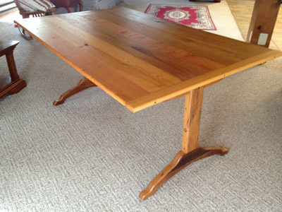 My second project below is a Shaker trestle table I made last year. The Shaker trestle table is a unique story. Two years ago my wife and I had an old barn on our property restored. The barn was built in the 1860s, and there was plenty of wood to salvage from it. I planed down a number of pieces and discovered some very nice oak boards. I had to be careful about any hidden nails. I decided to make a Shaker trestle table as a special present for my wife out of the old boards salvaged from the barn that was in her family for generations. I planed the wood to inch thickness for the majority of the table except for using several two inch thick boards planed down to one and one-half inches for the legs. The trestle legs and stretcher board were constructed using mortise and tenon joints. I made a breadboard top out of 3/4 inch oak boards. The boards expanded and contracted a bit as they were stored for over a century in the old barn in varying weather conditions, but I was pleased with the project overall as it looked rustic. Our house is a converted barn with old pegged rustic beams from the 1800s, and the simplicity of Shaker design seems to fit well with the decor.